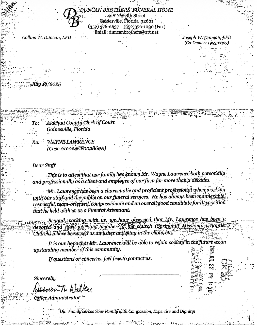 In the letter, Duncan-Walker appeared to be speaking for Duncan Brothers Funeral Home as a whole. The letter and her commissioner status were acknowledged in court at the sentencing hearing.