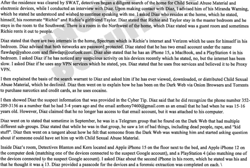 Ridge reported, “Diaz went on to state that sometime in September [2024], he was in a Telegram group that he found on the dark web that had multiple different subgroups. Diaz stated that while he was in that group, he saw a lot of bad things, including dead people, rape, and ‘kid stuff.’ Diaz then went on a tangent about how he felt that someone from the dark web was watching him and started [questioning] if someone could have set him up with CSAM.”
