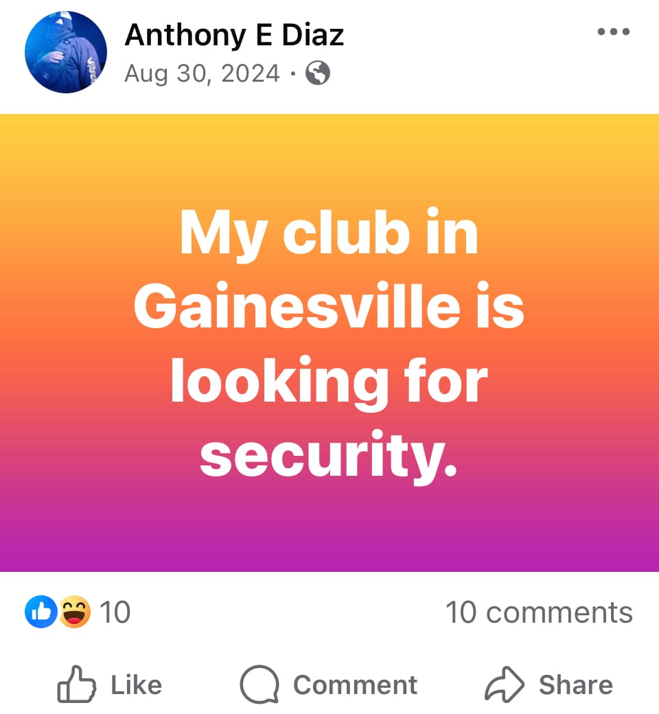 Ridge reported, “AT&T provided that for the IP address 45.17.13.236, the billing party is Elixir Lounge Smoothies LLC, located at 112 SW 1st Ave, Gainesville, FL 32601. I researched this business and found that it is a closed establishment but is now known as Bricks Night Club or Spurred Up Saloon. While researching the new business at this location, I found a review from [July 28, 2024] written by Anthony E. Diaz, which corroborates the [individual] I located during an investigative search of the suspect’s phone number. I also located a potential Facebook account for Diaz, under the name Anthony E. Diaz, where he references ‘my club in Gainesville’ in a post. I contacted Internet Crimes Against Children Detective D. Montague with [the] Gainesville Police Department, who conducted an in-house search for Diaz. Det. Montague advised that their agency has received calls from Diaz, who stated that he was a bouncer/security at the location.”