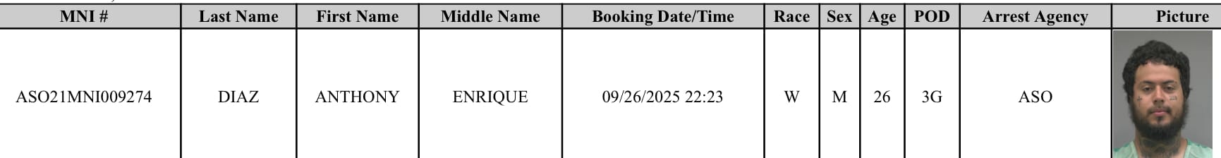 On September 26, 2025, Alachua County Sheriff’s Office deputies arrested Diaz and charged him with aggravated battery.