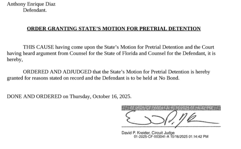 On October 1, 2025, the State Attorney’s Office filed a pretrial detention motion on Diaz that was later granted by Judge David Kreider.