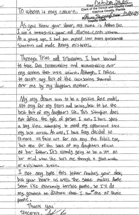 On October 23, 2025, Diaz submitted a letter to Kreider where he states he is a Marine Corps veteran and has “made plenty mistakes.”