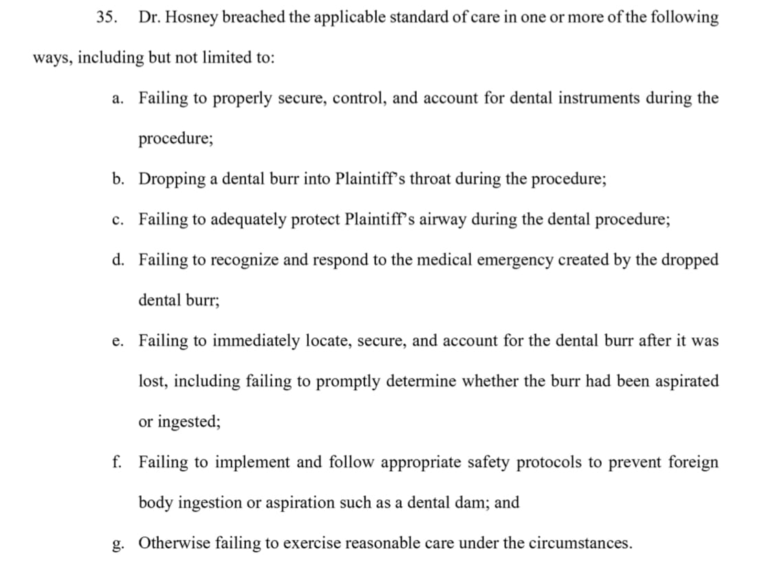 The lawsuit states, “Hosney negligently dropped a 2.5-centimeter dental burr into [Plaintiff’s] throat, which she inadvertently swallowed and/or aspirated while laying in a supine position with her mouth open. Following the swallowing and/or aspiration of the dental burr, Dr. Hosney failed to immediately locate, retrieve, or account for the foreign object, and failed to initiate appropriate emergency protocols to confirm its location or otherwise prevent further injury.”