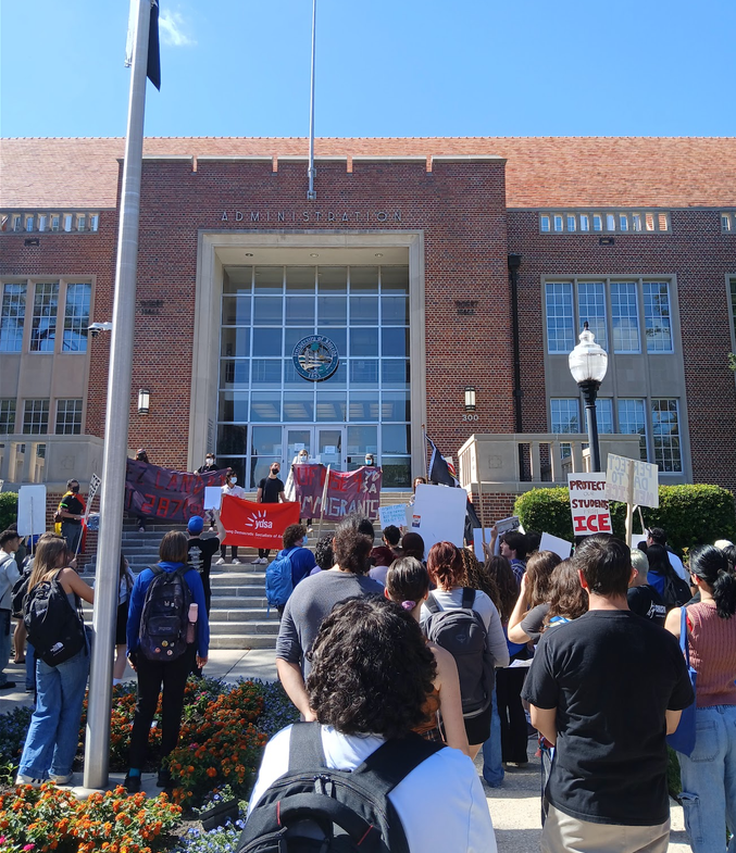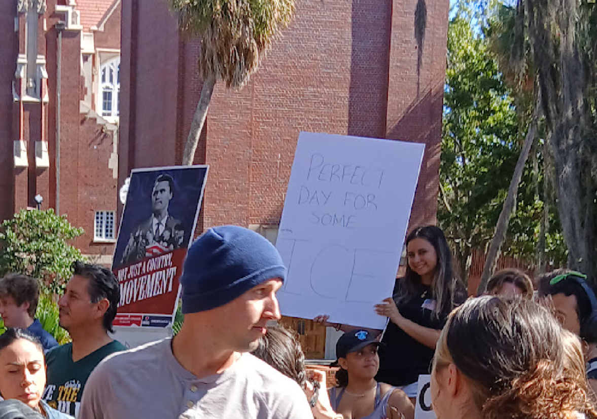 The crowd then marched from Turlington to Tigert Hall, chanting as they moved. Upon arrival, however, they found the administrative building’s doors locked, barring them from delivering a petition to university officials. This mirrored the outcome of a previous anti-ICE protest and was seen by organizers as a deliberate tactic of avoidance.
