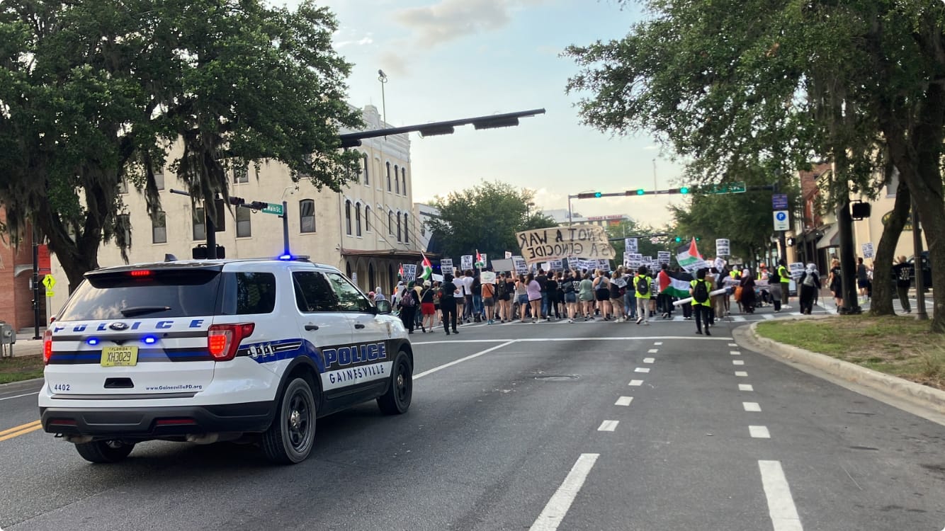 As a crowd of roughly 120 people covered the downtown streets, a Gainesville Police Department (GPD) patrol vehicle began tailing the crowd with its lights on.