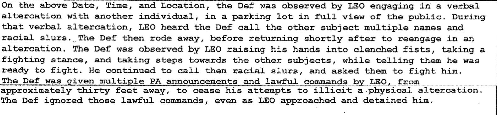 Snitselaar reported, “[Morris] spontaneously stated that he was defending himself, despite LEO observing him approach and engage the subjects. Once detained, [Morris] advised he engaged in the altercation because the subjects were black, and that ‘LEO should understand.’ [Morris] was also visibly intoxicated. His breath emanated alcoholic beverages in the form of beer. He had glassy eyes, slurred speech, and could not stand without swaying. He also could not follow simple questions without repeating himself.”