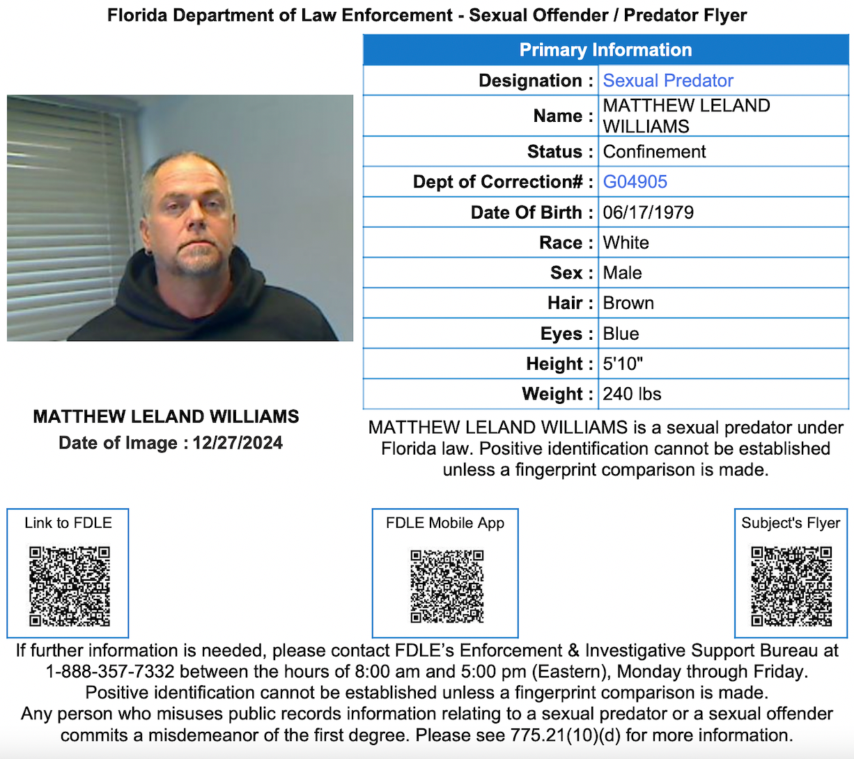 Registered sexual predator Matthew Leland Williams, 45, was arrested on Wednesday and charged with three counts of failing to comply with sexual predator registration requirements.